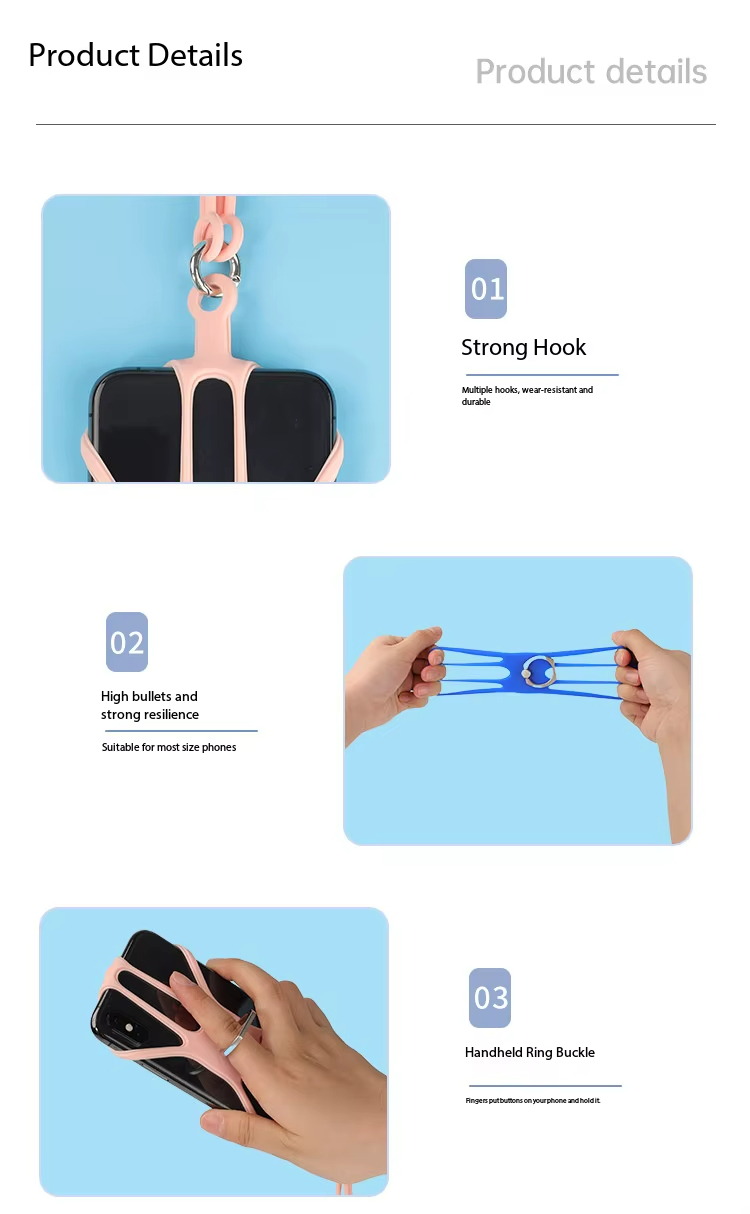 - Secure Anti-Drop ProtectionThe soft, stretchable silicone holder wraps snugly around your phone’s corners, providing a firm grip that prevents slips and falls. Wear it around your neck or wrist for peace of mind in crowded places or during active use.